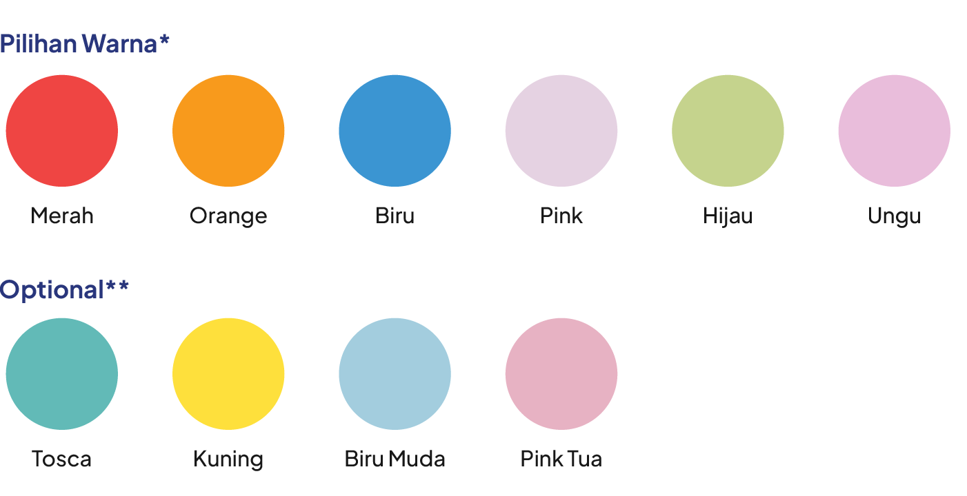 | Warna* | Biru, Hijau, Merah, Orange, Pink, Ungu |